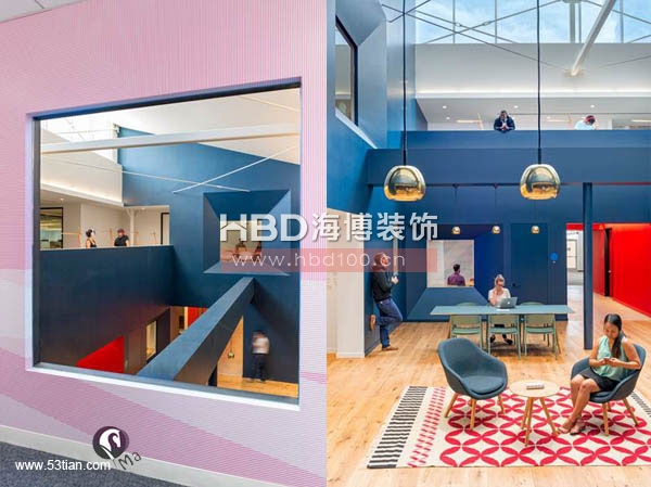 接下來廣州裝修公司海博裝飾小編帶你來看一組國外辦公室裝修純色劃分空間設計的案例,通過純凈的色彩來進行空間隔斷,劃分出不同的功能區域。如下圖的辦公空間,藍色是各個部門的會客區、紅色區域設計為休息兼走廊、灰色與白色區域為工作區域。整個空間使用顏色劃分區域來看,工作區顯得更為常態,而展示給客戶的區域在用色上更為大膽。